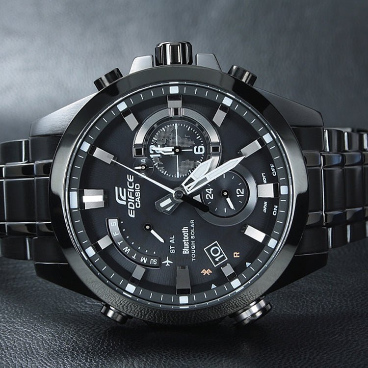 QUARTZ WATERPROOF SPORTS EDIFICE SOLAR POWERED STAINLESS STEEL STRAP MENS BLACK ANALOG EQB-510DC-1A